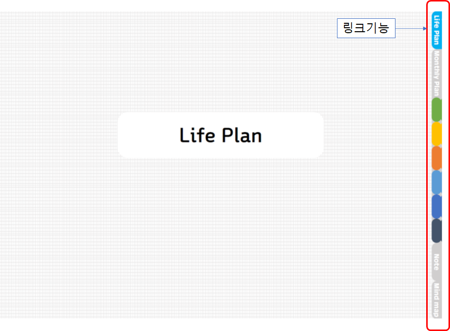 기본 형태는 3P바인더를 오마주하여 만들었으며, 월간, 주간, Life plan 등 이동이 가능하도록 링크기능을 만들었습니다.