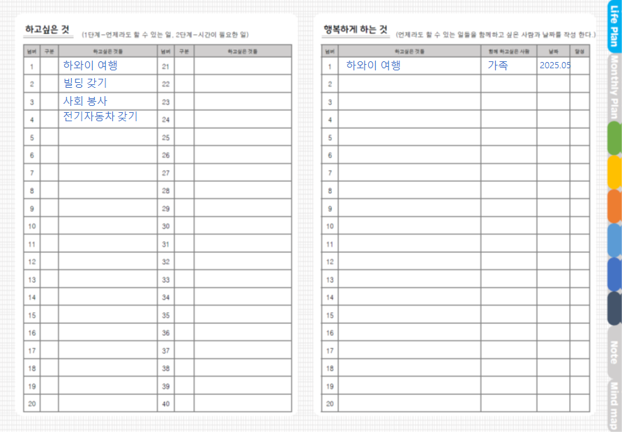 두번째 장은 "하고싶은 것", "행복하게 하는 것"을 기입하는 공간입니다.